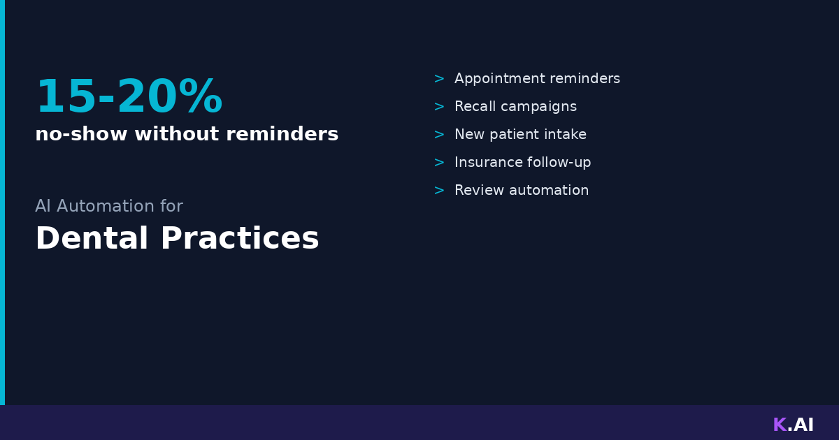 It’s Monday morning. Your front desk is juggling phone calls, checking in patients, and manually texting appointment reminders. Meanwhile, 47 patients are overdue for their six-month cleaning, and nobody has time to call them. This is the reality for most dental practices. The clinical work is excellent. The admin work is drowning everyone. AI automation can fix this — not by replacing your team, but by handling the repetitive tasks that eat up their day. ...