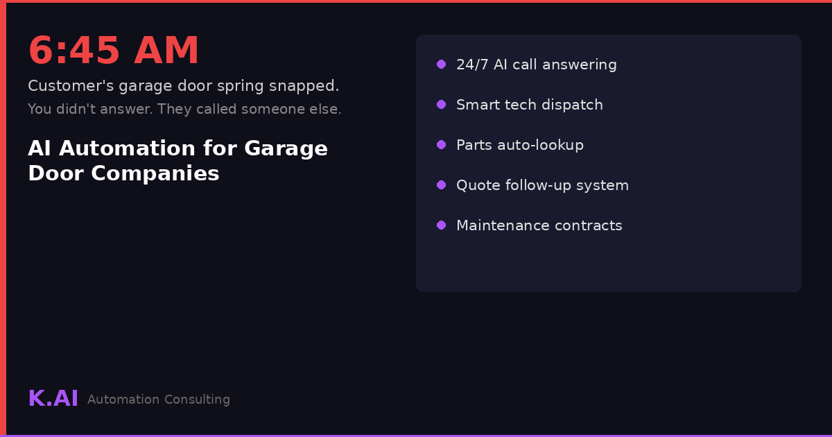It is 6:45 AM on a Monday. A customer’s garage door spring snapped and their car is trapped inside. They call your shop. Nobody picks up because your office does not open until 8. They call the next company in Google. That company answers. That company gets the $400 repair. Garage door companies live and die by phone responsiveness. Between emergency repairs, seasonal installation surges, and the constant churn of warranty callbacks, your office staff is already stretched thin. Adding more volume means adding more people, or it used to. ...