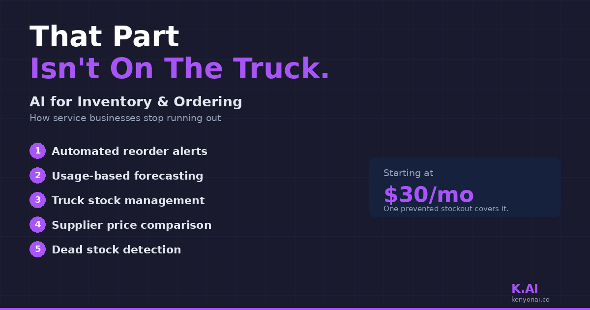 Your best technician is 30 minutes into a job when he realizes the part he needs isn’t on the truck. It was supposed to be restocked last week, but nobody noticed the bin was empty. Now you’ve got a half-finished job, a frustrated customer, and a tech making a 45-minute round trip to the supply house. This happens in every service business that touches physical inventory. HVAC companies run out of capacitors. Plumbers run short on fittings. Electricians need a breaker panel that’s backordered because nobody checked lead times. Cleaning companies run through supplies faster than expected during flu season. ...