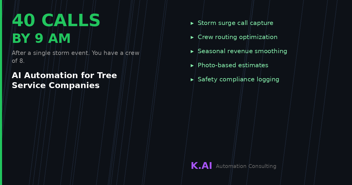 A big storm rolls through on a Thursday night. By Friday morning, your phone is ringing off the hook. Downed limbs, split trunks, trees leaning on fences and power lines. You have 40 calls by 9 AM and a crew of 8. Some of those calls go to voicemail. Some callers hang up and try the next company. By the time your office catches up on Monday, half of those emergency jobs went to whoever answered the phone first. ...